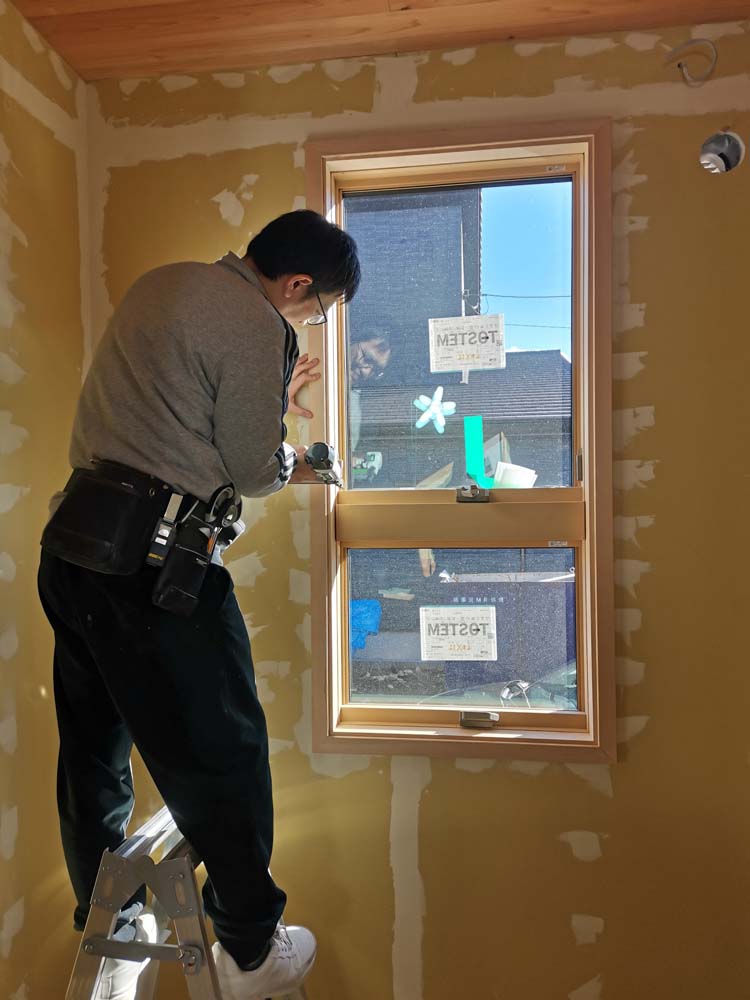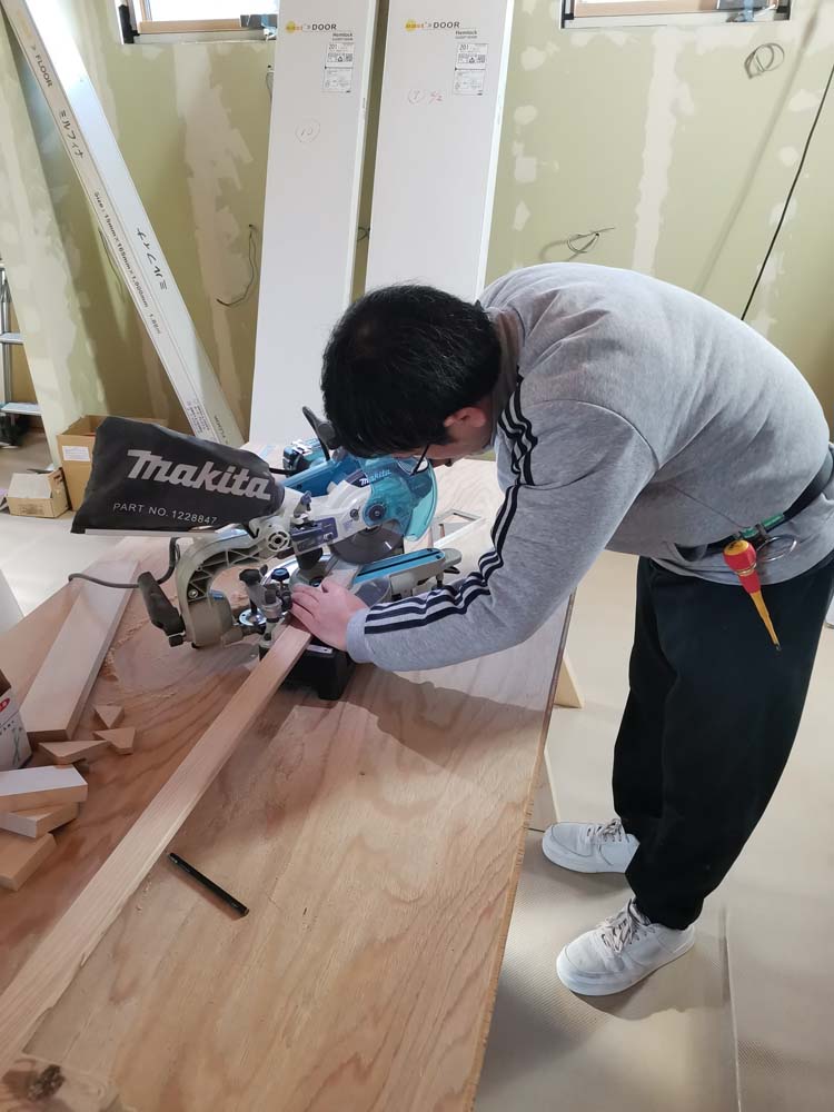 大工さんの壁石膏ボード貼りと続けて施主さんのパテが終わったので、次の工程(窓の額縁ケーシング、巾木)のレクチャーを行いました。