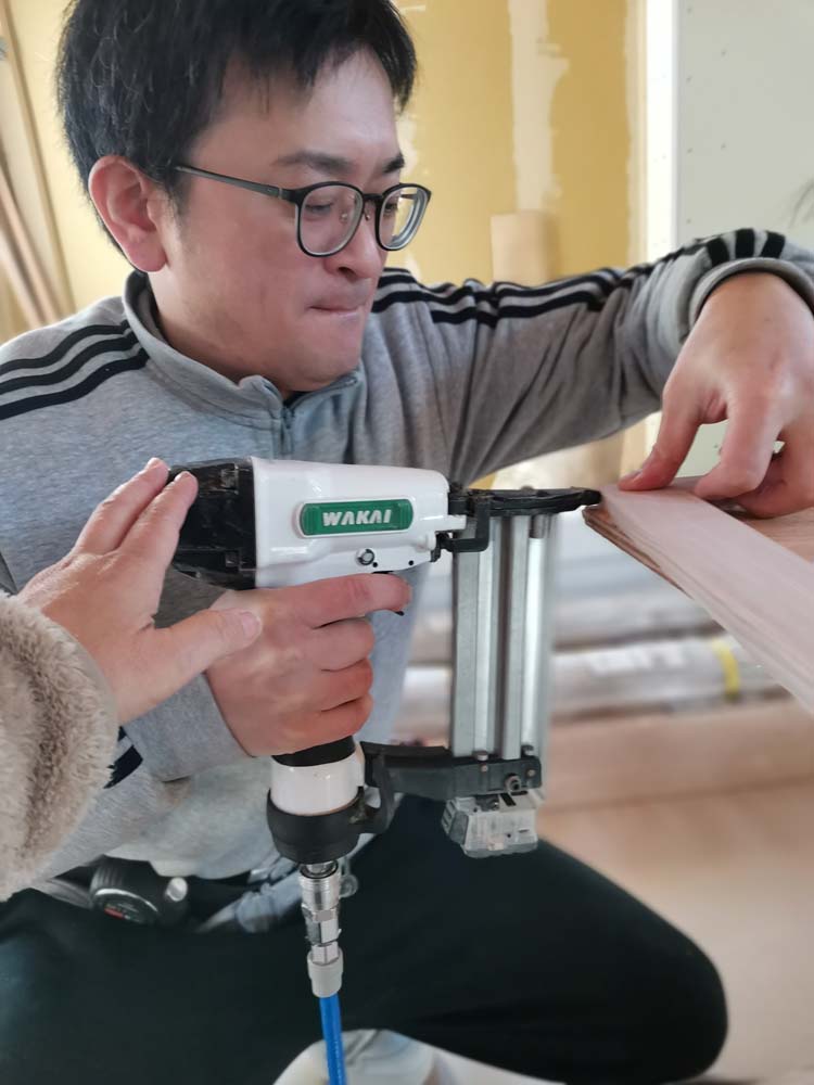 2025年12月6日 床フローリングレクチャー 床専用のエアー釘打ち機フロアタッカーでフローリング材を床暖房置き根太に留めていきます。フローリングメーカー指定のスペーサーを板と板の間に挟んでいます。