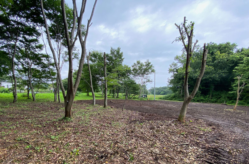 2021年7月13日 伐採抜根整地工事 土地の北側と東側には草原、牧草地が広がっています。理想的な里山のリモートワーク環境です