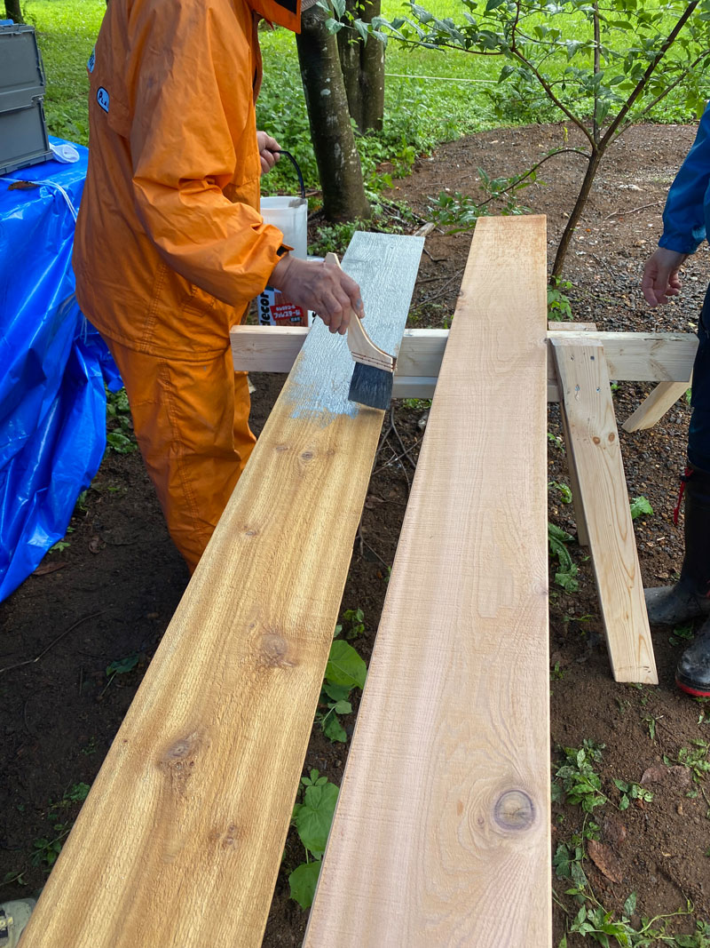2021年8月13日 外壁材塗装 レッドシーダーはざらざらしたラフ面が表です。