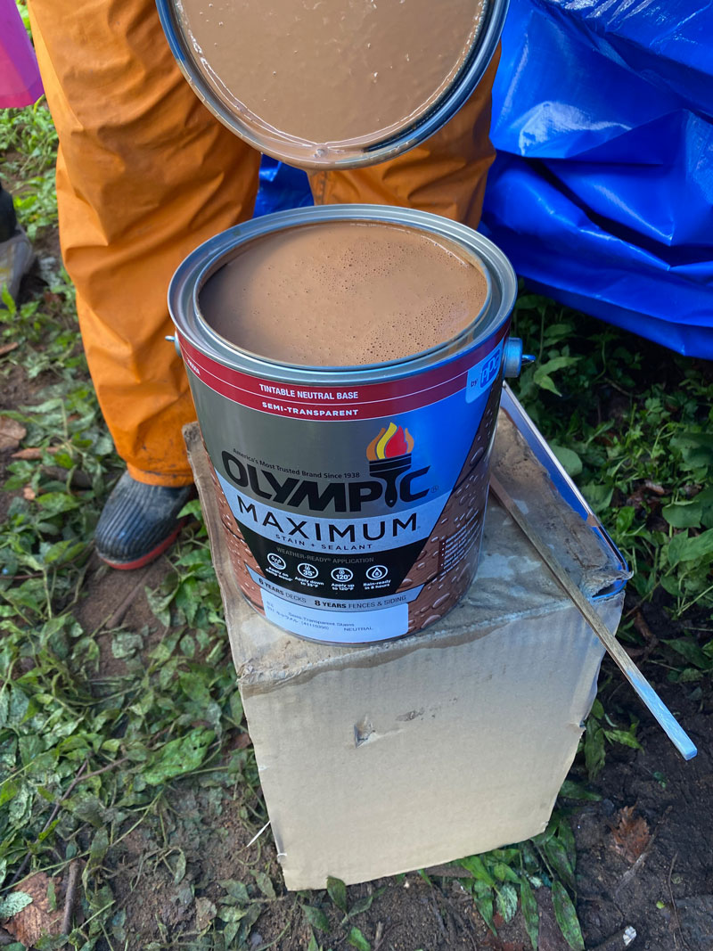 2021年8月13日 外壁材塗装 軒天井・ポーチ天井に塗るオリンピックマキシマ・キャラメル色、渋いいい色です