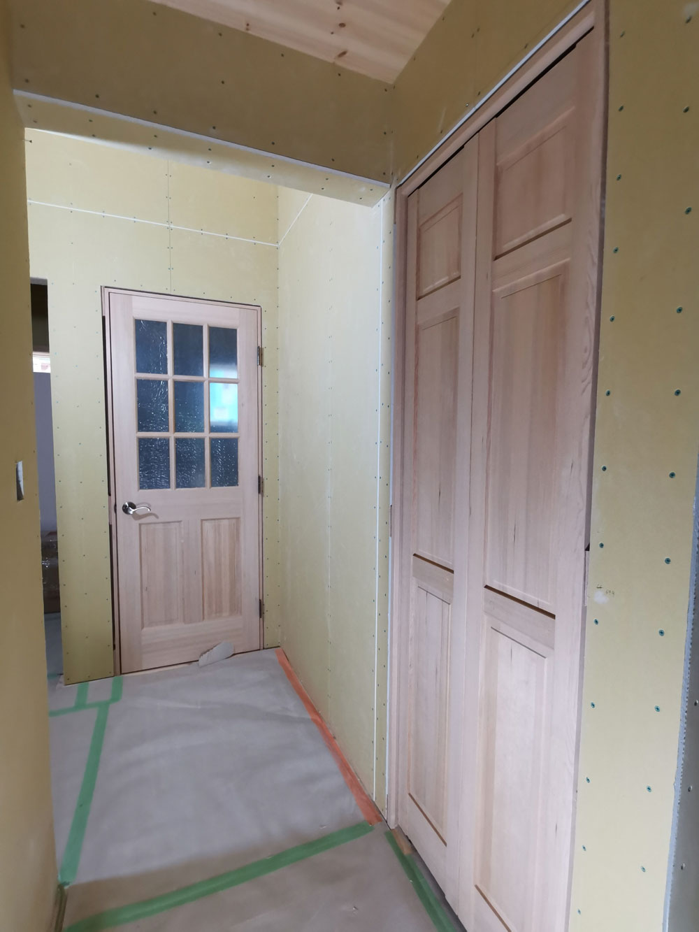 大工さんの壁石膏ボード貼りが終わり、今日から施主さんは石膏ボードのパテ塗り、窓のケーシング(額縁)取り付けを開始します。