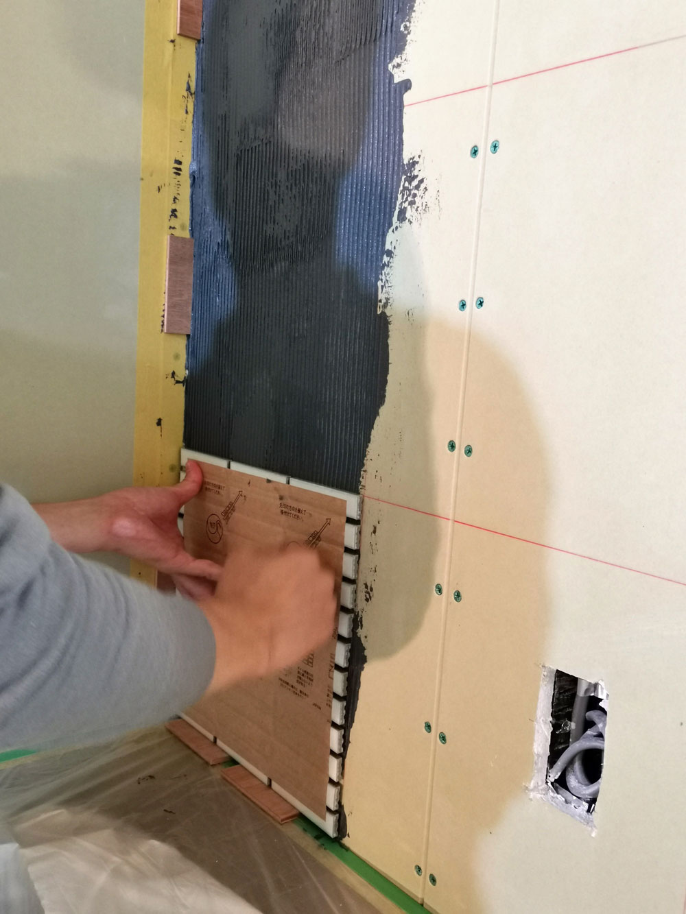 2022年9月22日 キッチンタイルレクチャー タイルシートが壁によく接着するまでしばらくこの状態で待ちます