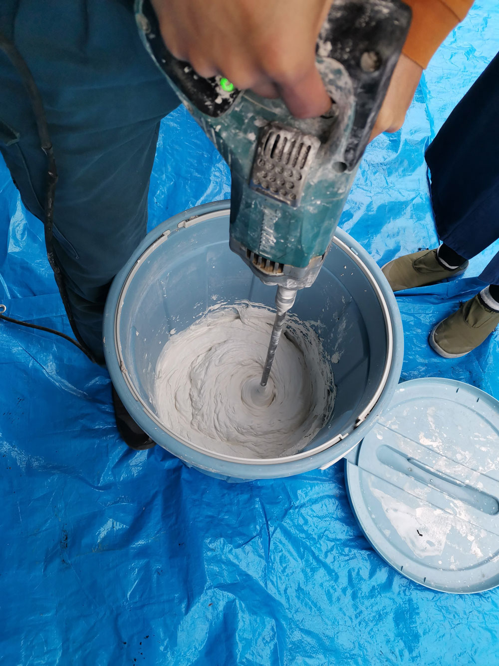 2022年10月5日 漆喰左官塗り ハーフビルドホームオリジナルの練り漆喰を使います。使う前にバケツに入れて軽く撹拌します。