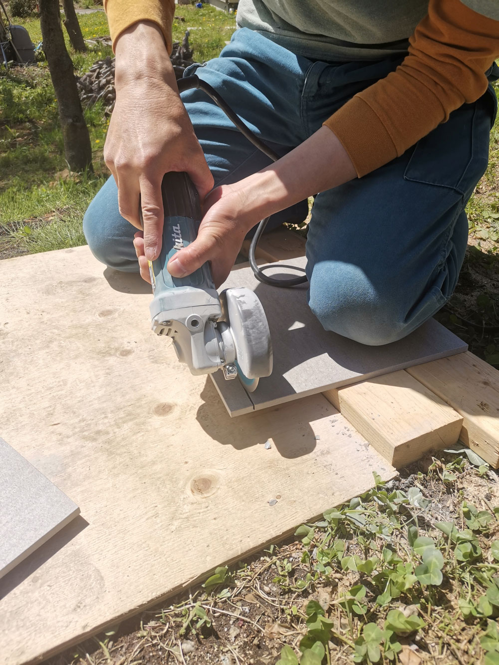2023年4月27日 土間タイル貼りレクチャー タイルはグラインダーでカットします
