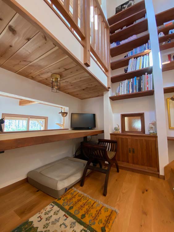 2025年8月28日 完成風景 ハーフビルドでは階段は大工が作りますが、作り付けの収納家具、明かり取り窓はDIYです