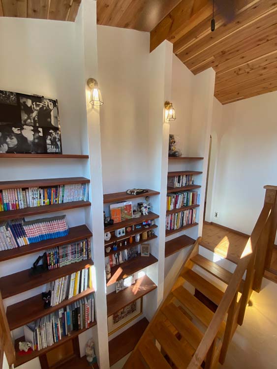 2025年8月28日 完成風景 階段吹き抜けの壁棚も自作、壁に棚板を埋め込んだ手の込んだ造作です