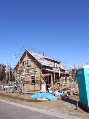 2012年1月30日 外壁サイデイング工事が完了。外壁=無垢レッドシーダ―ベベルサイデイングにキシラデコール・ウオルナット色塗装、窓=マーヴィンインテグリティー木製ペアガラスサッシ、玄関ドア=シンプソン木製断熱ドア