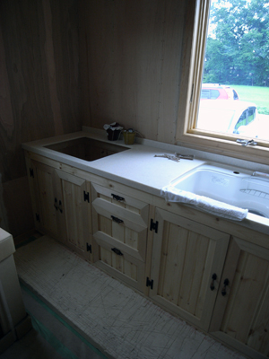 オーダーメイドしていた人造大理石のワークトップ(天板)が入荷し、早速キャビネットに乗せてみたらピッタリ!! 扉と引出しも順調に製作中です