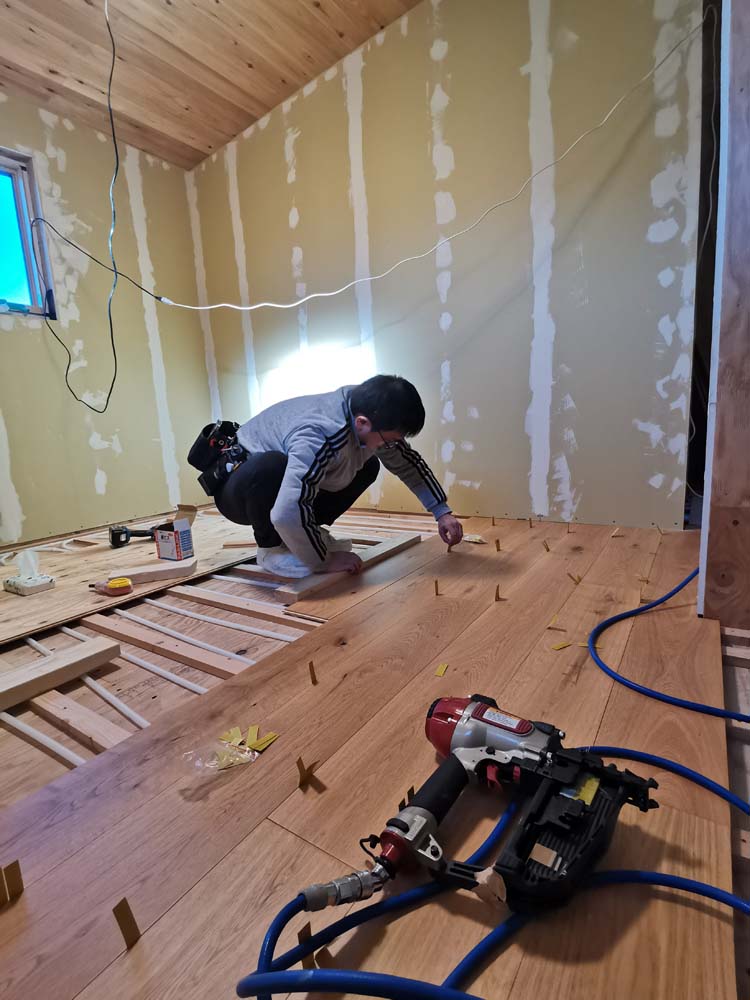 あいかわらず施主Mさん作業が早いです、今日は床フローリング貼りのレクチャーを行いました。