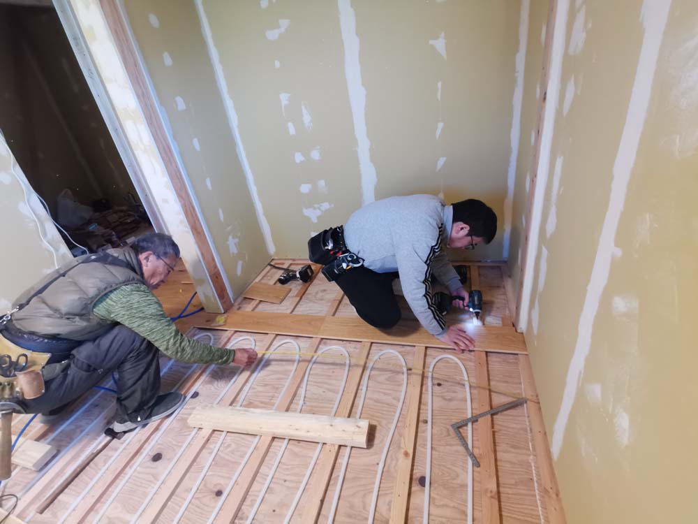 2025年12月6日 床フローリングレクチャー 床暖房の置き根太を30センチ間隔で取り付けした後、床暖房工事業者が温水が循環するパイプを根太間に敷設しその後フローリング材を貼ります。