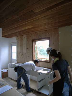 2012年7月8日 当社レクチャー担当の管野さんは以前高級輸入キッチンを作っていた職人さん、彼の指導により、浜友の無垢材キッチンを組み立てていきます