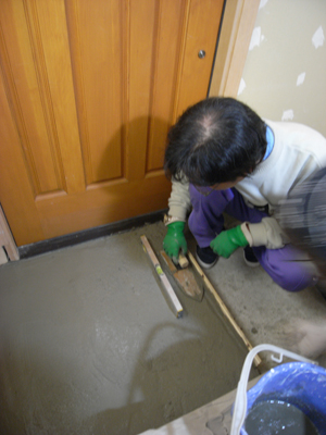 桐生2 2010年12月9日 まずは玄関土間のタイル張りから開始。(左)水を少なめに練ったモルタル=パサモルタルを木コテで必要高さまで盛ってタイルの下地を作ります。(右)モルタル下地の水平を水準器でチェックしたら、つぎにタイルを下地に接着させるためのセメント水をまんべんなく塗り均します