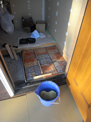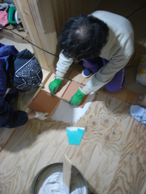 桐生2 2010年12月9日 キッチンの床にはテラコッタタイルを張ります。こちらは床下地合板の上に直接タイル接着剤を塗り張っていきます