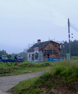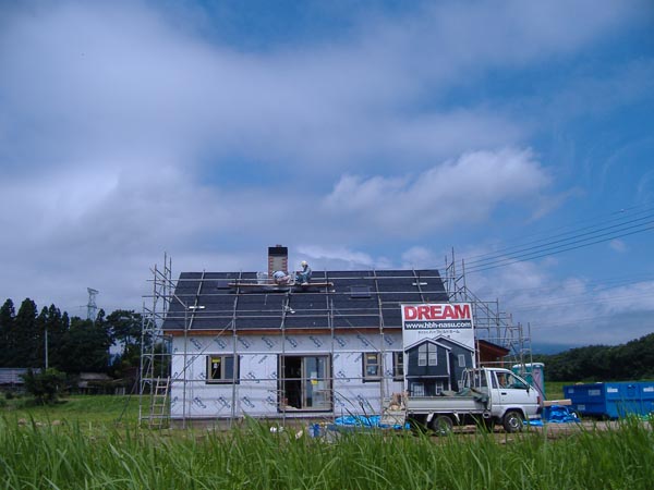 梅雨明け盛夏の高原、青空の下、煙突レンガ工事再開!