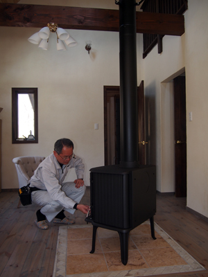 2014年3月31日 実は建物自体は1月に完成していたのですが、この薪ストーブMORSOのリニューアル機種の入荷が大幅な遅れたため、この日を待っての完成お披露目とななりました。ソファにすわるとちょうど目の高さに炎が見えるので、いつまでの炎を見ていたくなる、そんな魅力のある薪ストーブです。リビングの中央に設置したため、。炉台も床フローリングとフラットになるよう計算して施工されてます。壁はご夫妻が苦労の末仕上げた土佐漆喰左官塗り仕上げ。うっくらとした土色の漆喰が日の光をうけてやわらかい空間をつくりあげています