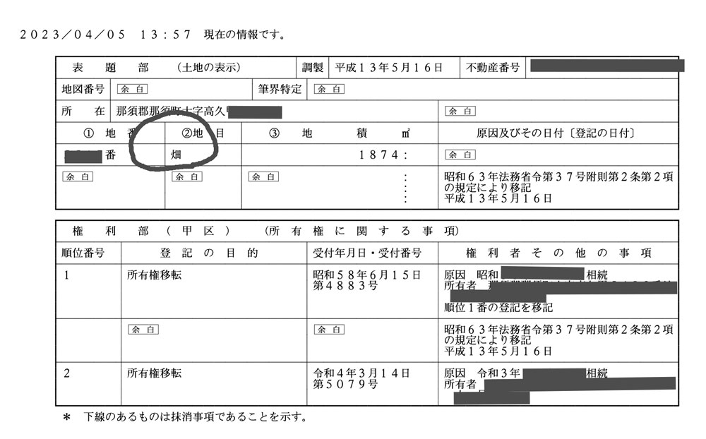 那須を車で走りながらいいなと思った土地の登記簿謄本(全部事項証明書)をスマホにダウンロードして見たら、②地目の欄に「畑」とありました。農地です。ぱっと見で農地には見えませんでしたが、長い間休耕地で使われていないでいると木が繁殖して林のように見えることもあります。農地は農地法で売買が厳しく規制されています。もちろん農地転用して売買することも条件が揃えば可能ですが、それには手間暇コストがかかるので、「農地」とあったらあきらめた方が無難でしょう。